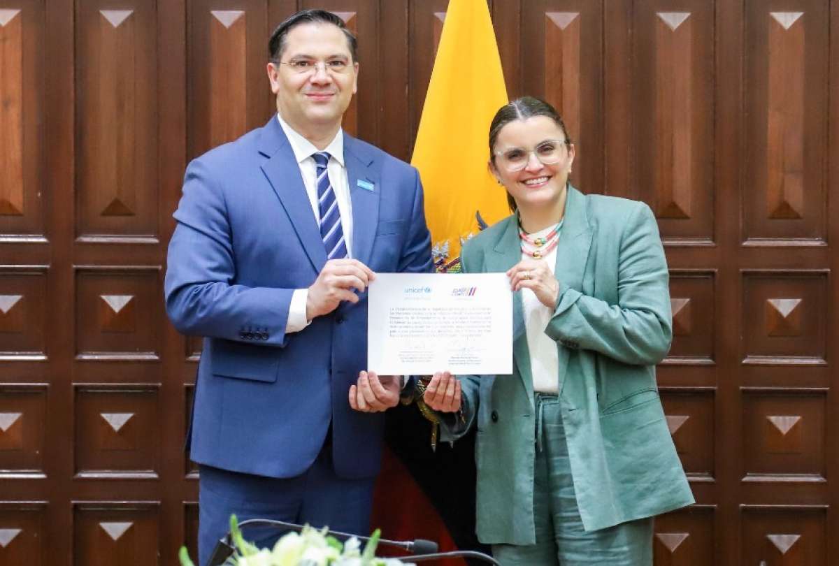 La Vicepresidencia de la República y UNICEF reforzaron su trabajo conjunto en defensa de los derechos de la niñez, tras la firma de un Memorando de Entendimiento entre la vicepresidenta María José Pinto y el representante de UNICEF en Ecuador, Arturo Romboli.