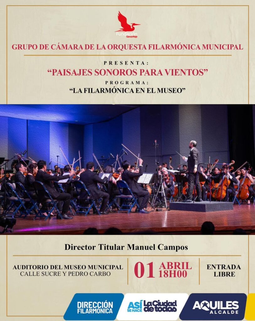 La Dirección General Filarmónica y de Educación Artística Municipal junto al Museo Municipal de Guayaquil, los invita al Concierto de Cámara “Paisajes Sonoros para Vientos” con el programa “La Filarmónica en el Museo”